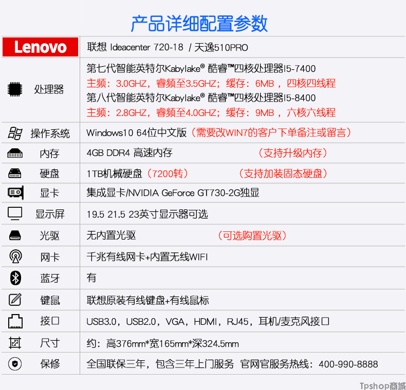 商品名称: 联想电脑台式机X315/510Pro/T4900V六核I5-8500 8G1T 2G主机整机
